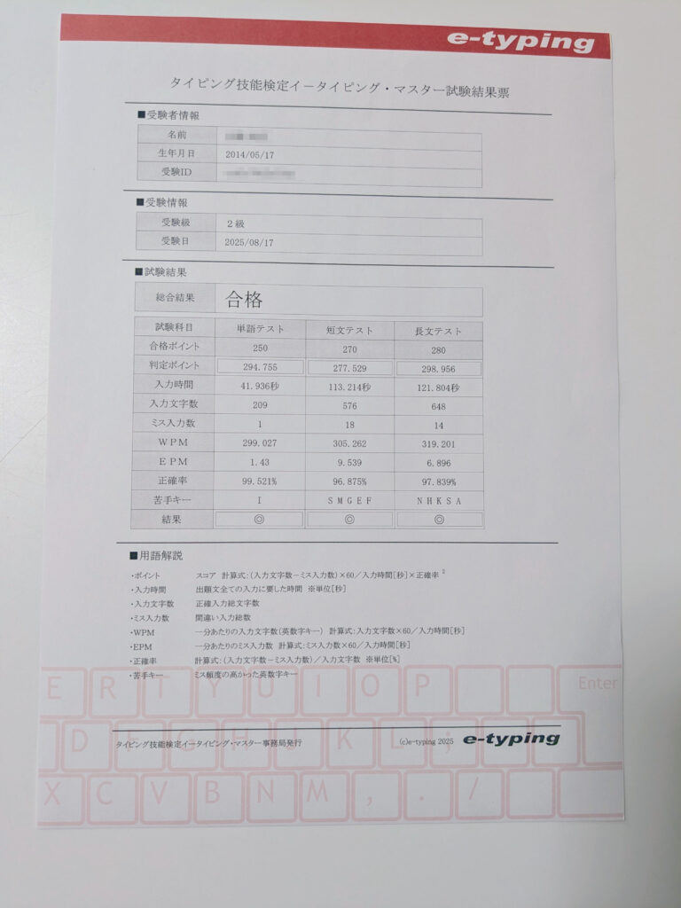 イータイピングの2級を受けたのは年齢でいうと、11歳と3ヶ月ちょうどの日です。